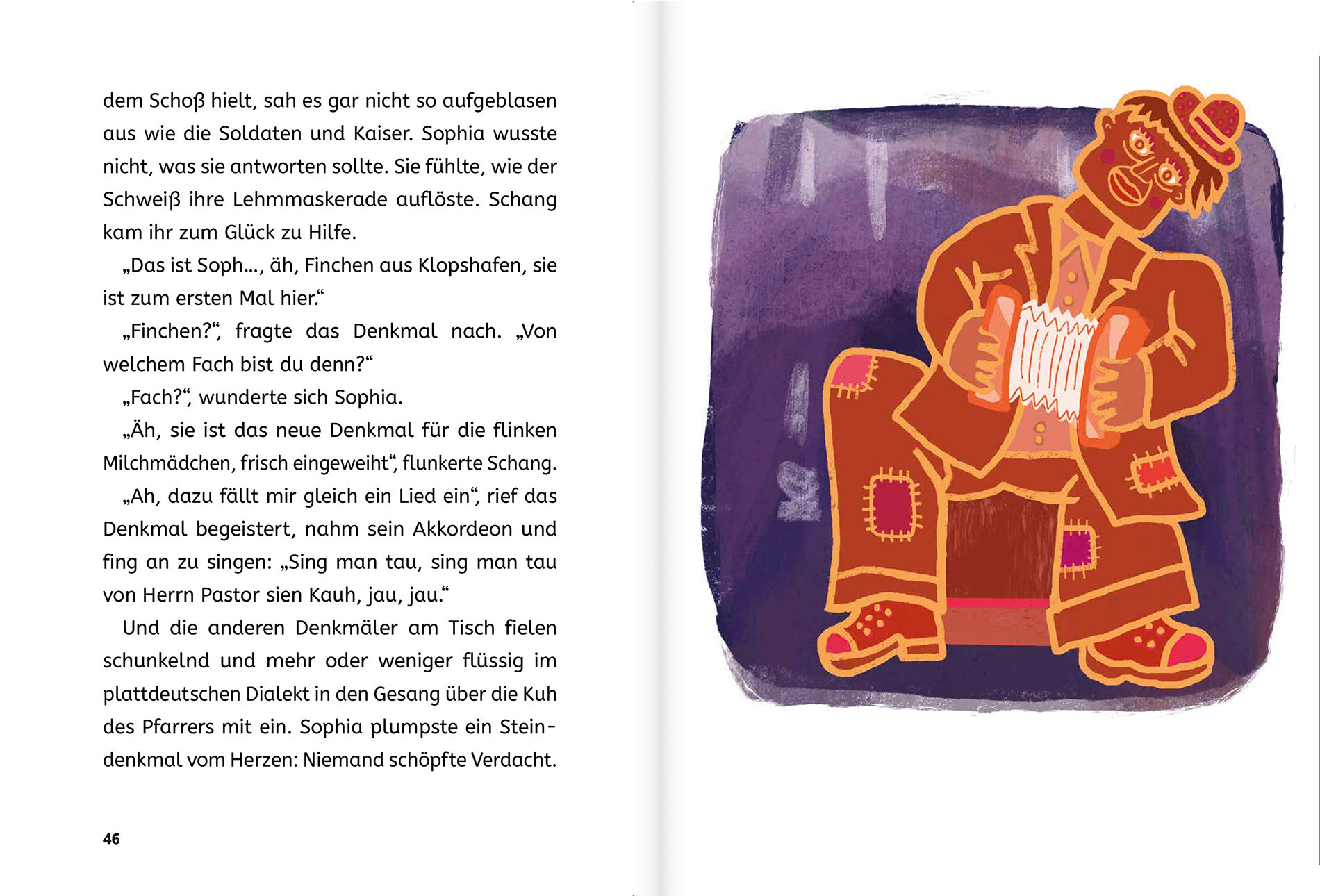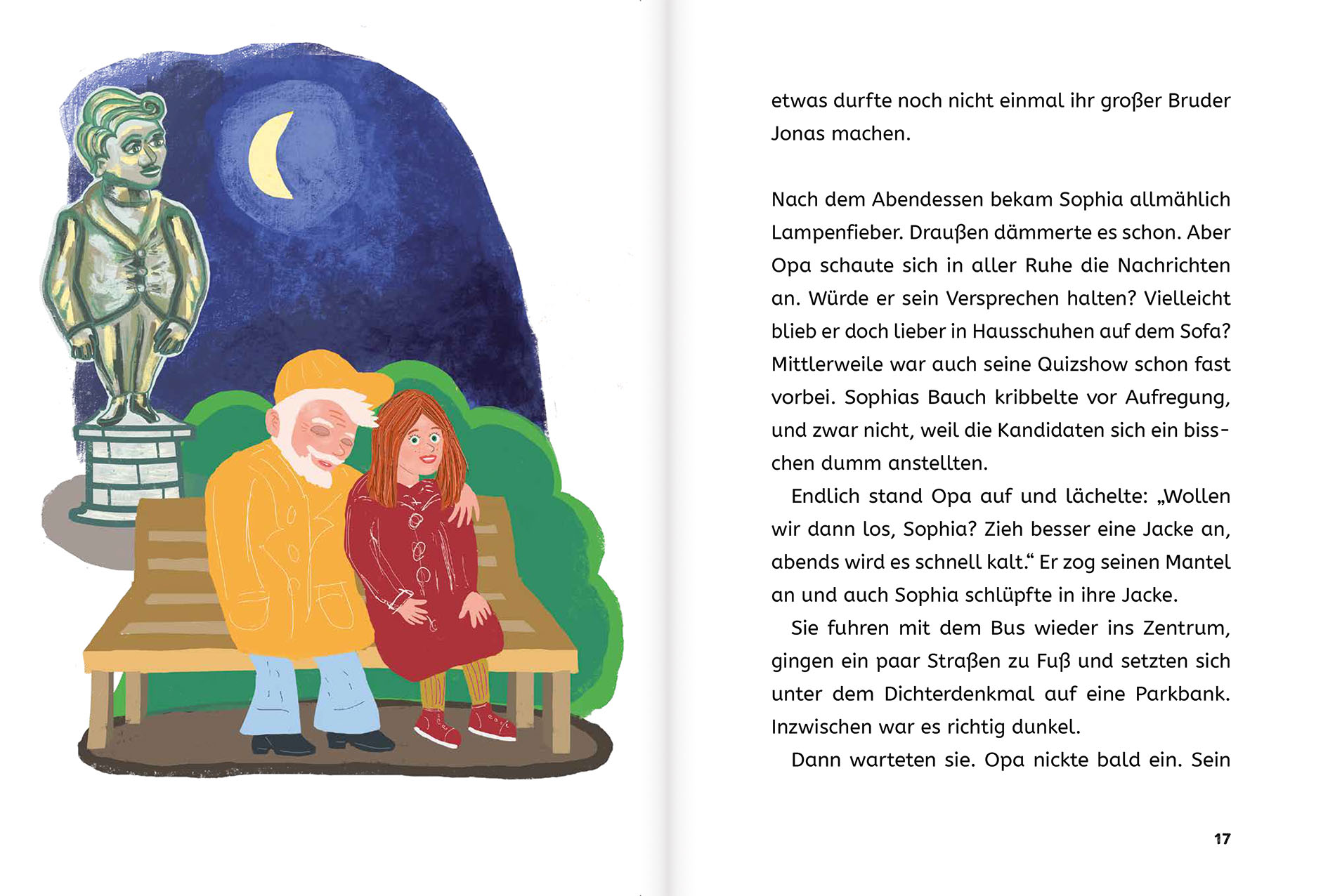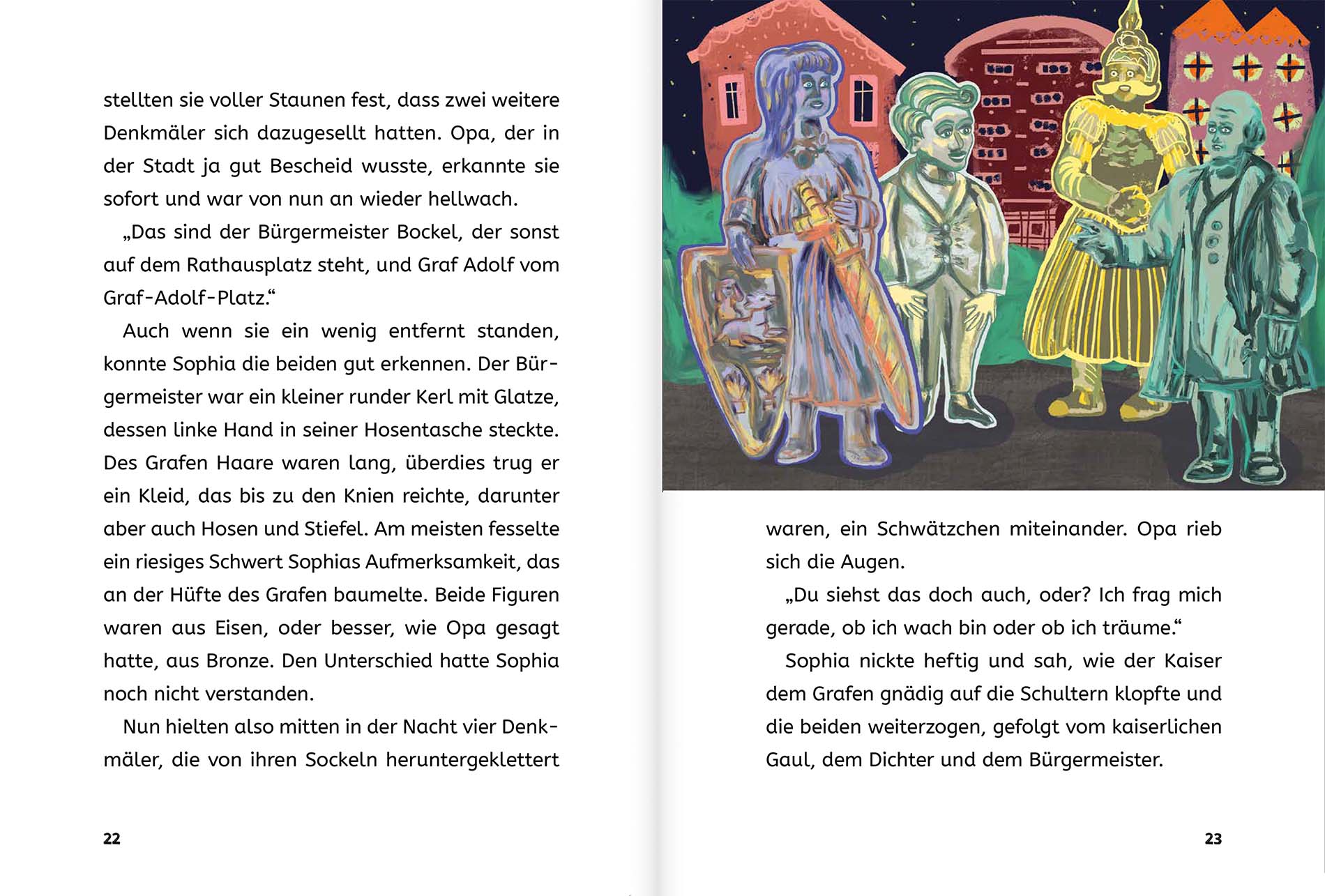 Die Geschichte beginnt ganz alltäglich: Sophia spaziert mit ihrem Großvater durch die Stadt, und wie alle pfiffigen Kinder stellt sie Fragen über Fragen. Als sie schließlich auf einer Parkbank neben dem Denkmal des Dichters Heinrich eine Pause machen, möchte sie wissen: „Was machen Denkmäler eigentlich nachts, wenn es dunkel ist und alle Menschen schlafen?“ Das ist eine dieser Kinderfragen, auf die selbst Opas keine Antwort wissen, und so beschließen die beiden: Finden wir’s raus! Als sie abends in den Park zurückkehren, passiert etwas Erstaunliches: Heinrich klettert von seinem Sockel und macht sich mit dem Reiterstandbild eines Kaisers auf in die Nacht. Aber wohin wollen sie nur? Nichts wie hinterher, heißt es da für das Gespann, und so werden Opa und Enkelin Zeugen einer bunt gemischten Denkmalversammlung: Generale und Adelige, Bürger und Philosophen, Künstler und Göttinnen – und nicht zuletzt der kleine Denkmaljunge Schang, der Sophia aus der Patsche hilft. Warum? Verraten sei nur so viel: Wer sich im Leben zankt, zankt sich auch als Denkmal ...