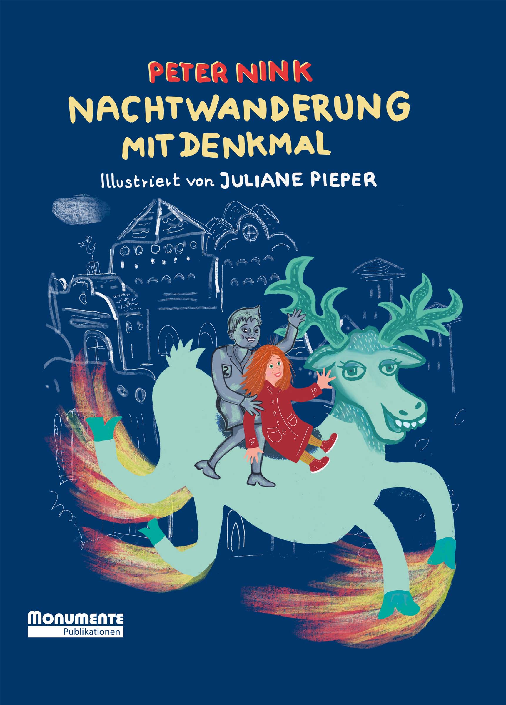 Peter Nink erzählt die wendungsreiche Geschichte von Menschen und Denkmälern voller Fantasie und Spannung. Er schreibt seit 20 Jahren Kindergeschichten für den Hörfunk – und so meint man das Säbelrasseln der Reiterdenkmäler, die Gesänge der Künstler und die vorwitzigen Stimmen von Schang und Sophia unmittelbar zu hören. Mit expressiven Bildern begleitet die Illustratorin Juliane Pieper die Geschichte: Nicht nur die Nacht, auch ihre Zeichnungen erwecken die Denkmäler zum Leben. Spielerisch stellt diese Geschichte für junge Leser ab neun Jahren einige der großen Fragen des Denkmalschutzes: Woran erinnern uns Denkmale? Und was ist erinnerungswürdig?